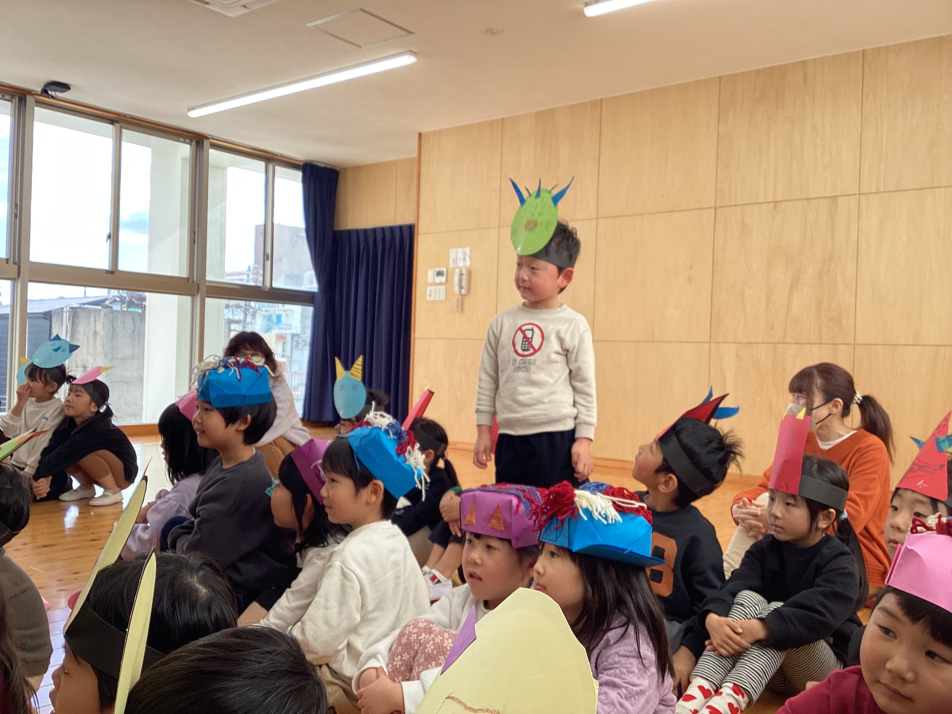 自分たちで作ったお面をかぶり、豆まきのうたを歌ったり絵本やペープサートを楽しみました。